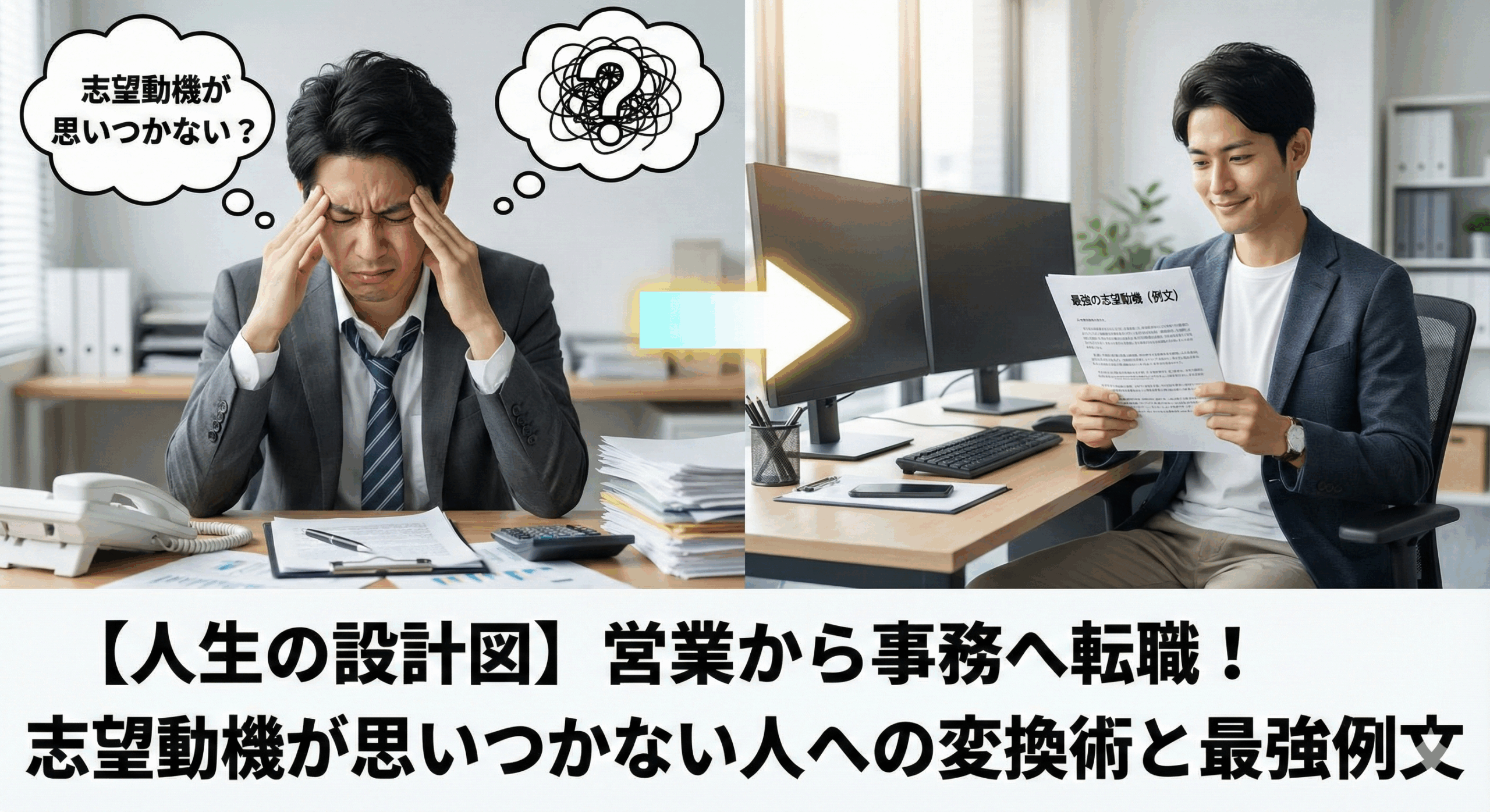 営業から事務への転職を目指す時、誰もがぶつかる壁が「志望動機の言語化」です。「営業が嫌だから」というネガティブな本音を、どうやって「事務がやりたい」というポジティブな理由に変えればいいのか。ここで悩みすぎて、応募すらできない人が大勢います。